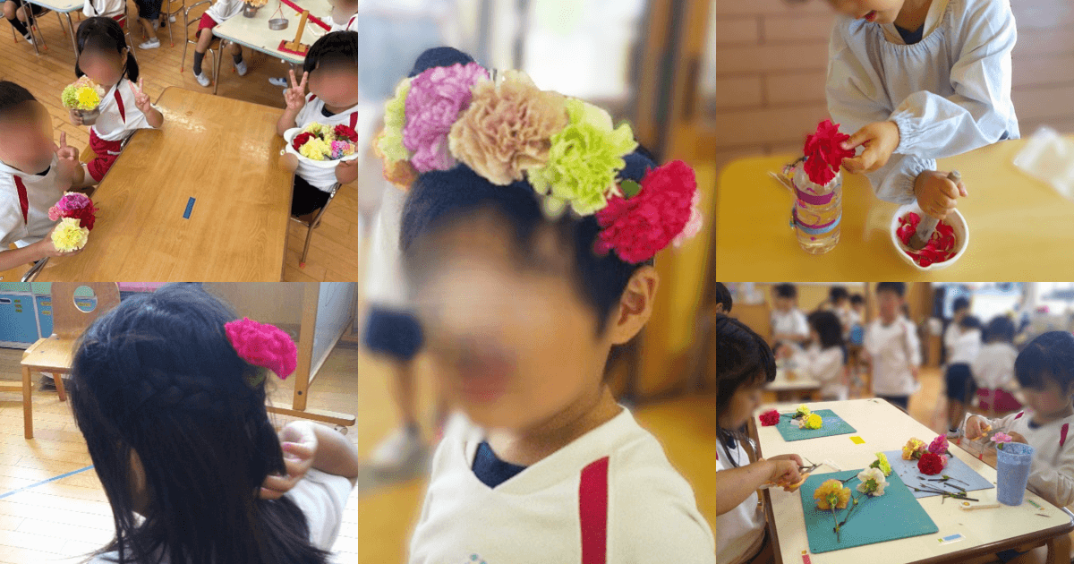 実践例として、くすのき幼稚園での取り組みをご紹介します。園児たちは届いた花を使って、花冠・首飾り・押し花・ブーケ・ドライフラワーなど多彩な制作に挑戦。教室には「きれい!」「いい匂い!」という声が響き、花を抱える笑顔があふれました(社内記録・提供素材)。