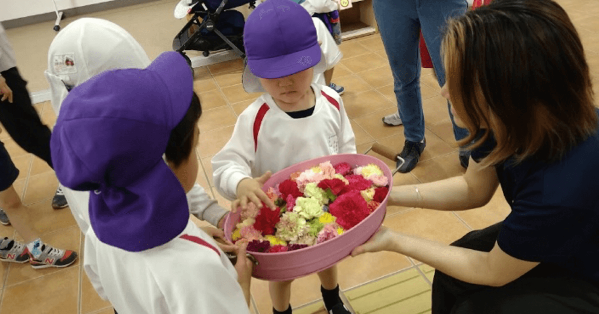 園で栽培している花や自生している花以外を見る機会が少ない子どもも多く、今回たくさんのお花を見られたことは貴重な経験になりました。カーネーションひとつとっても色の多様さがあり、香りを楽しむ姿もあり、五感への刺激にもつながったと感じています。